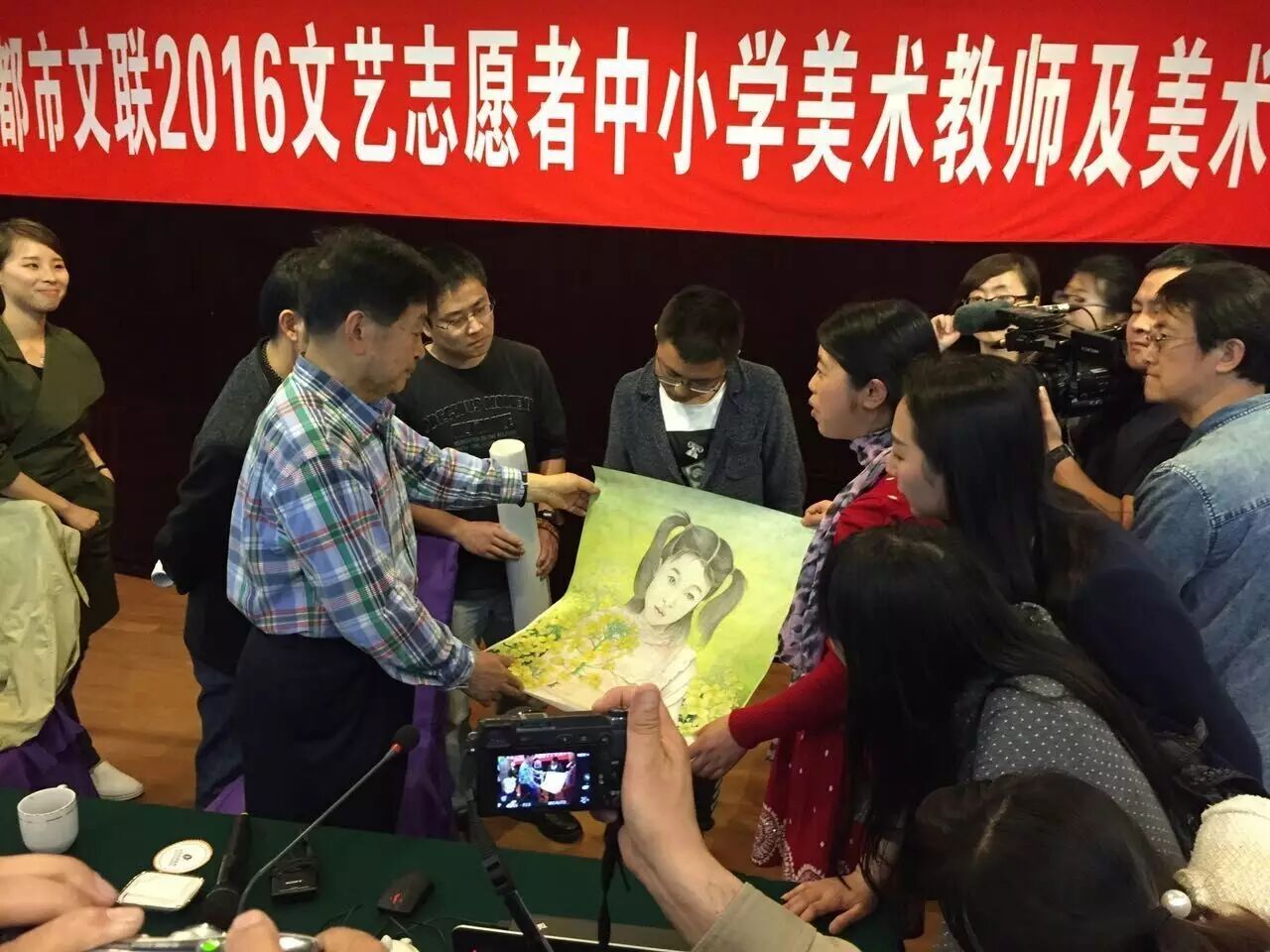 活动当天还邀请了著名艺术家郭汝愚先生来到现场为大家讲述了自己的艺术经历和自己对艺术的理解与体会。因为郭老师在现场精彩的发言,让大家深刻的感受到这位艺术大师对艺术的热爱和将艺术与生活融为一体的生活态度,这些都让在座的各位深表佩服。郭老师还和大家一起交流,并在现场为大家的作品进行指点,现场气氛非常热闹,郭老师的指导给基层的老师们带来了很大的帮助,让各位老师由更高的水平去培养下一代学子。成都市文联宋主席表示,以后需要多开展这样的活动,让我们的老师们能有更多的机会和正真的艺术大师进行交流,让大家无论在绘画技巧还是在对艺术的理解上更好的提高自己,为我们的下一代带去更高质量的艺术教育。