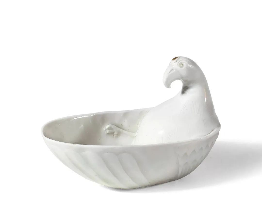 本品杯呈塑贴鹦鹉形,通体施白釉,鹦鹉其翼伸展成杯,小眼尖嘴,鸟首之上点褐彩装饰,以模仿真实鹦鹉之效,双足藏于器内,外翼以阴刻方式装饰羽翼,是具放生及实用结合器,混然天成。白釉莹洁雅致,造型古朴,同类传世极为罕有