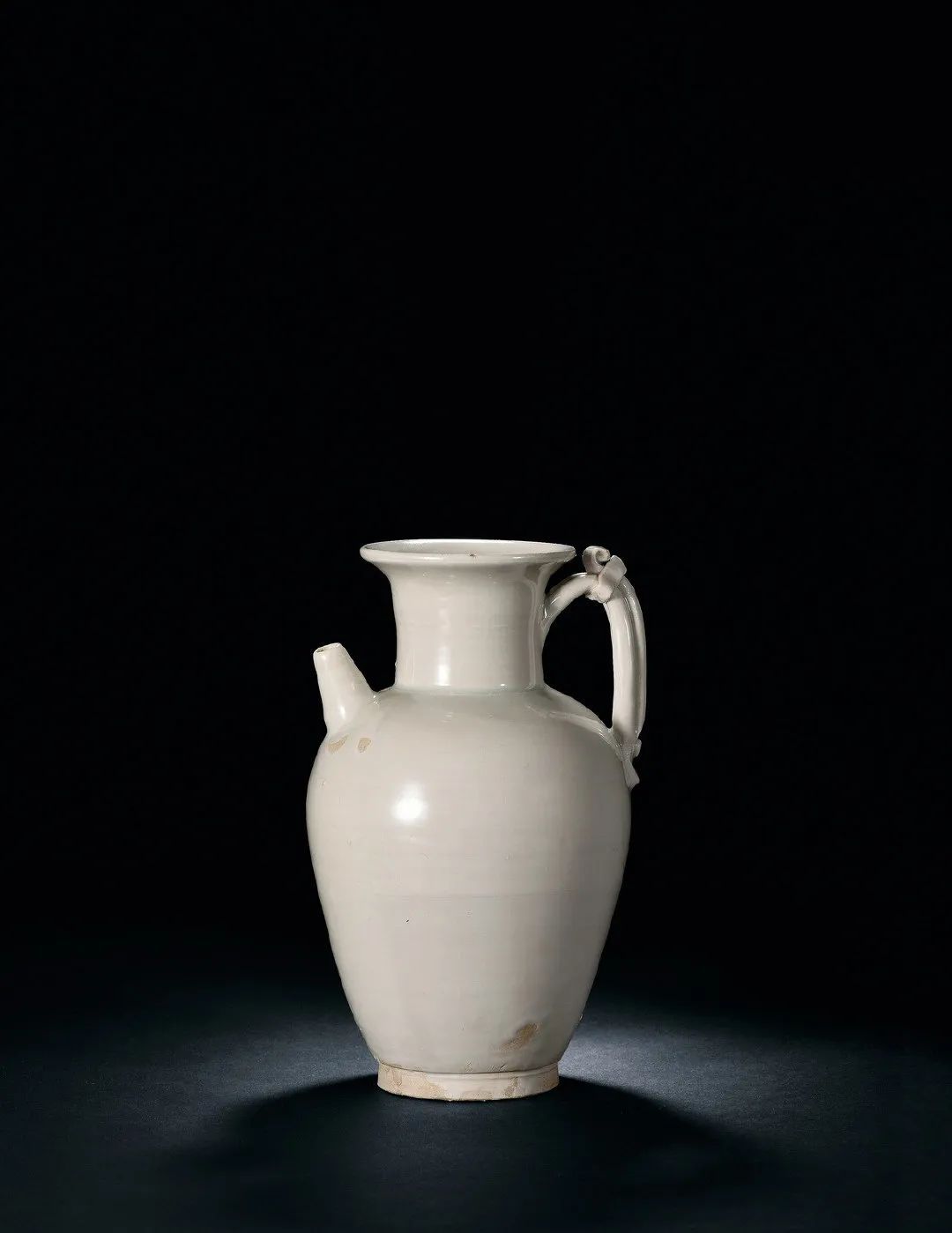此件邢窑白瓷壶侈口长颈,前肩缘设短流,把柄有扣为穿系,肩部丰满,腹高而直,圈足,器形浑圆饱满,线条流畅,造型优美。该壶胎质致密坚硬,除足部外均施白釉,釉质均匀纯净,洁白光润,通体素净,盈润可人,全器清素简洁,规整典雅,给人以既雍容饱满而又凝重大方的美感,为白瓷之佳品。
